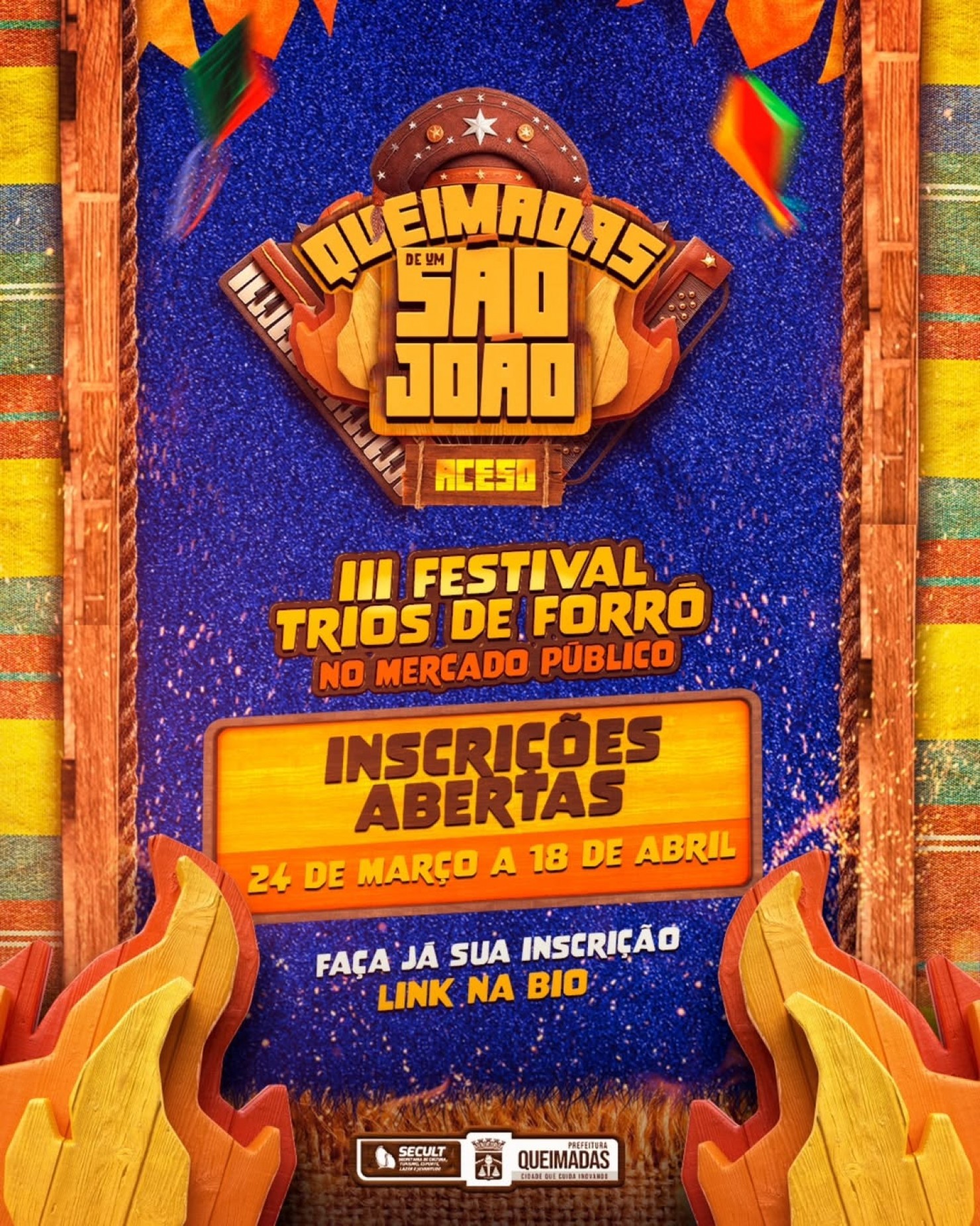 A Prefeitura Municipal de Queimadas, através da Secretaria de Cultura, Turismo, Esporte, Lazer e Juventude (SECULT), anuncia o início das inscrições para o III Festival de Trios de Forró. O evento integra a programação do "Queimadas de um São João Aceso" e tem como objetivo valorizar e dar visibilidade aos trios de forró, que desempenham um papel essencial na preservação da cultura nordestina.