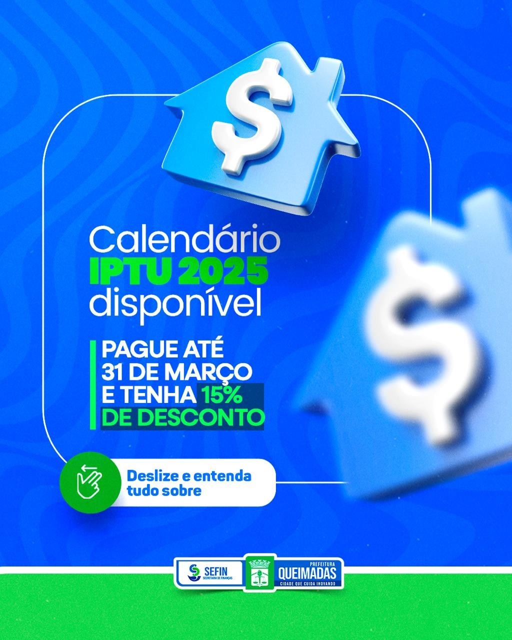 A Prefeitura Municipal de Queimadas-PB divulgou o calendário de recolhimento do Imposto Predial e Territorial Urbano (IPTU) referente ao ano de 2025. Os contribuintes têm até o dia 30 de abril para realizar o pagamento em cota única. Quem quitar o imposto até 31 de março terá 15% de desconto sobre o valor original.