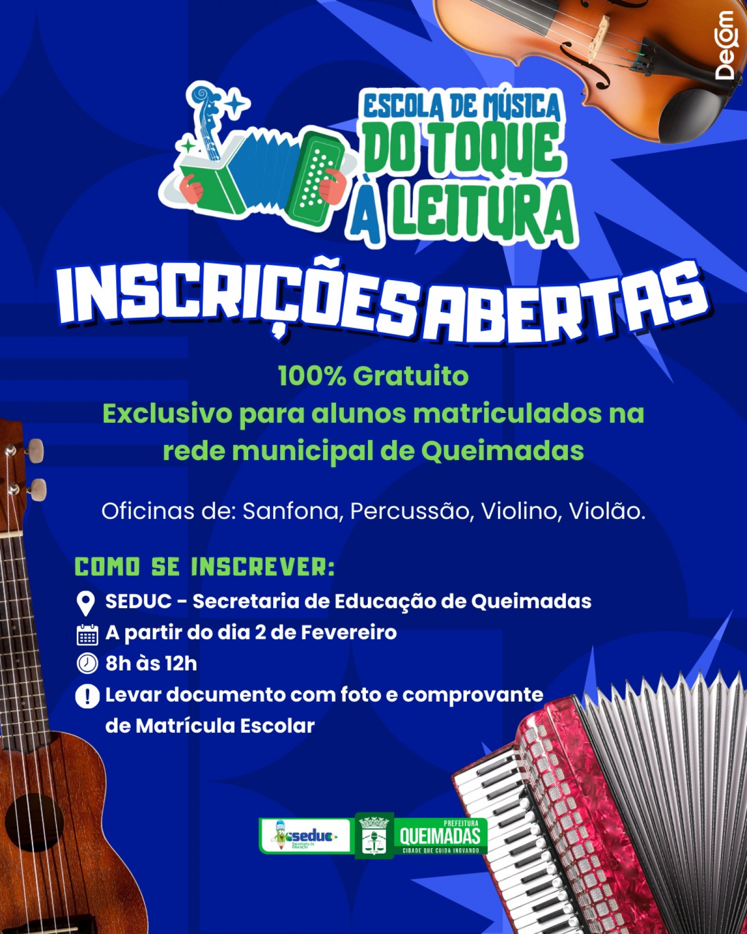 Prefeitura Municipal de Queimadas, por meio da Secretaria Municipal de Educação, está com inscrições abertas para a escola de música “Do Toque à Leitura”, um projeto que visa incentivar a formação musical e cultural de estudantes da rede municipal de ensino.